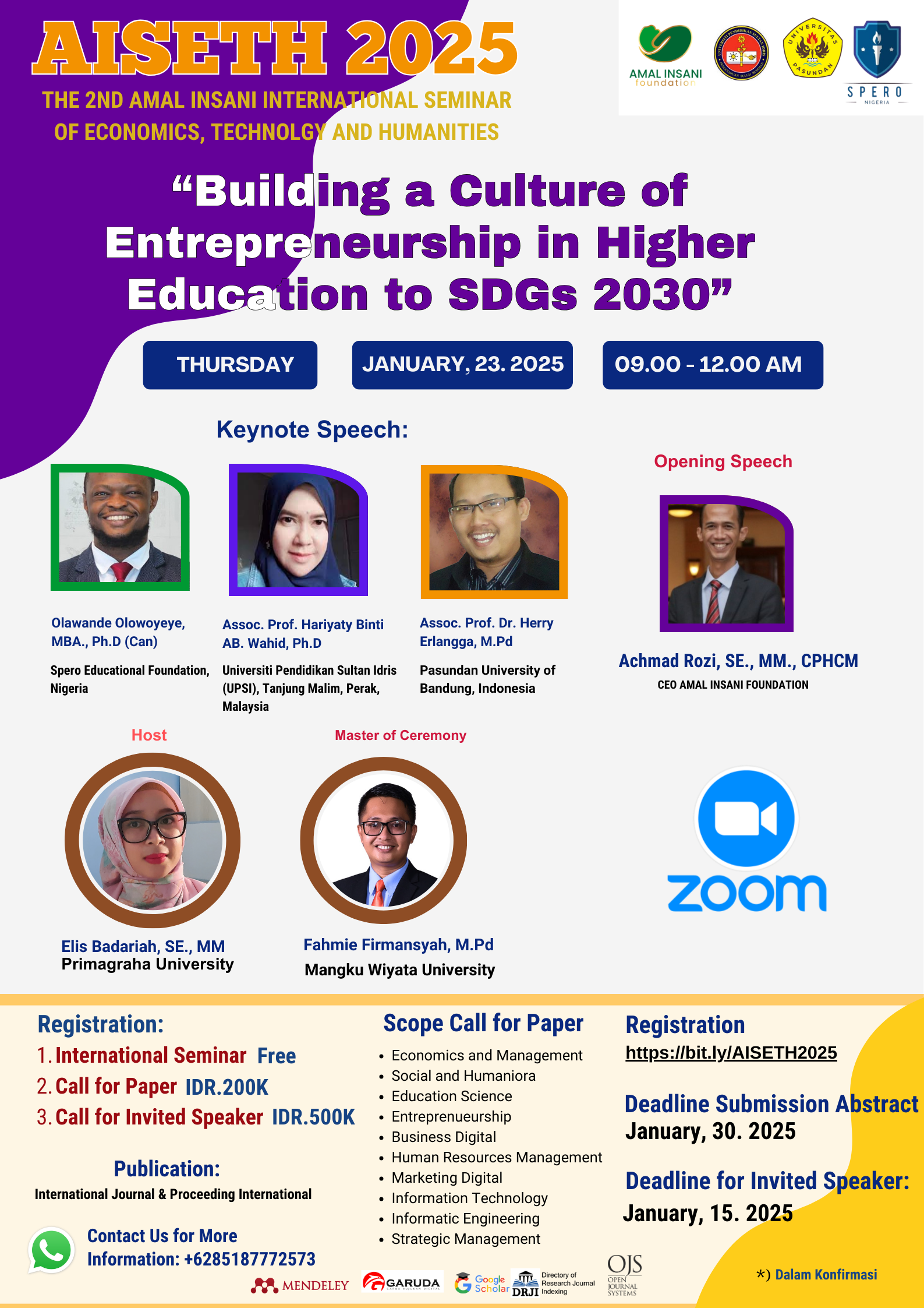 Vol. 2 (2025)Prosiding Internasional Vol. 2 (2025) merupakan luaran dari Seminar Internasional yang dilaksanakan oleh Amal Insani Foundation melalui AISETH Batch 2, yang menghadirkan dua Pembicara Luarnegeri dan satu pembicara dari dalam negeri. Theme of Seminar is: “Building a Culture of Entrepreneurship in Higher Education to SDGs 2030”