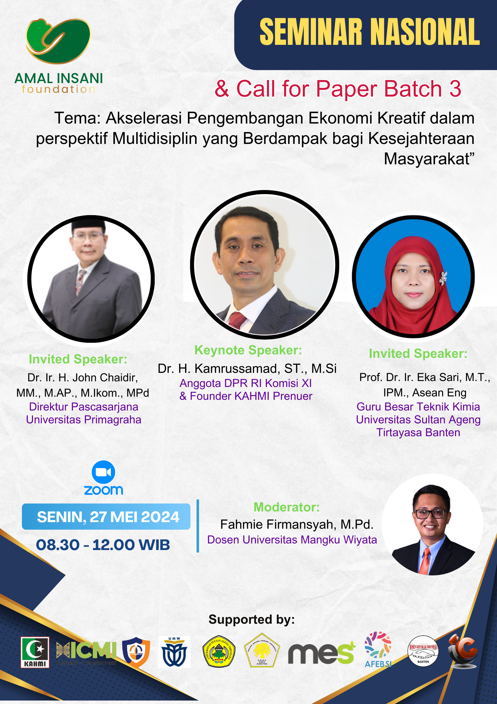 Vol. 2 (2023)Prosiding Nasional batch 2 ini merupakan luaran dari Seminar Nasional yang dilaksanakan oleh Amal Insani Foundation pada, 6 Juli 2023, dengan tema: "Strategi Membangun Inovasi & Keunggulan Bersaing Perguruan Tinggi di Era Disruptif."